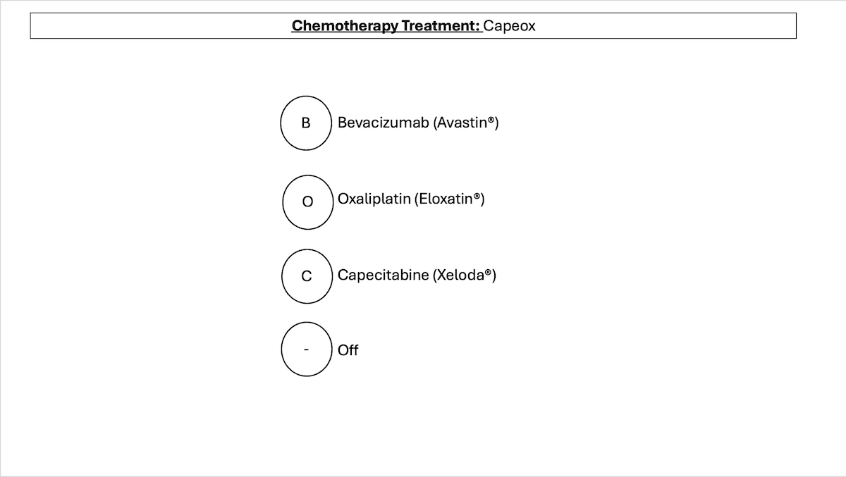 This calendar is for patients receiving the medications Bevacizumab, Oxaliplatin, and Capecitabine for treatment of colon cancer. This treatment may also be called Capeox. This article contains 2 images that can be printed out and used as a resource during treatment.