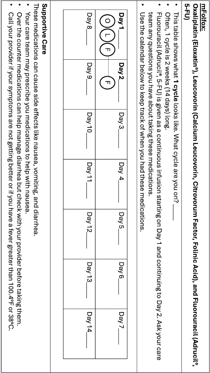 This calendar is for patients receiving the medications Oxaliplatin, Leucovorin, and Fluorouracil for treatment of gastrointestinal cancers. This treatment may also be called mFolfox. This article contains 2 images that can be printed out and used as a resource during treatment.