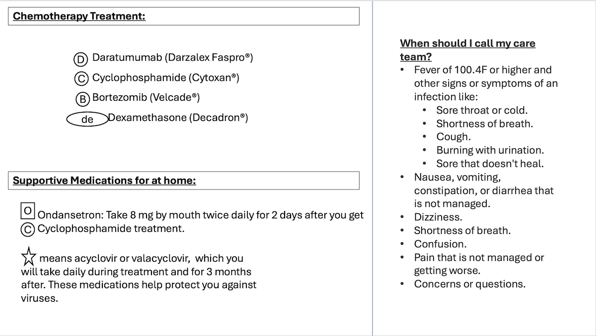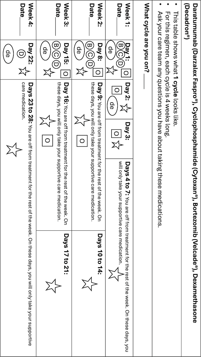 This calendar provides information for patients receiving Daratumumab, Cyclophosphamide, Bortezomib, and Dexamethasone for treatment of multiple myeloma. This article contains 2 images that can be printed out and used as a resource during treatment.