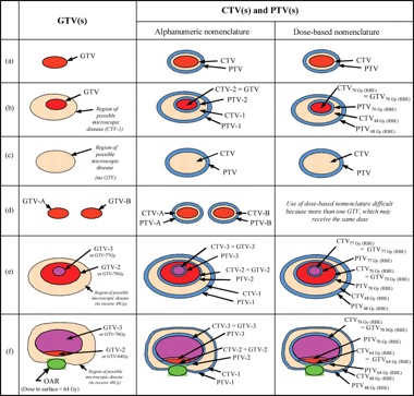 In field naming, the International Commission on Radiation Units and Measurements (ICRU) has recommended that multiple nested volumes be labeled in a distinct fashion from spatially separated volumes. The ICRU recommends that nested volumes be listed by defined name (i.e. GTV or CTV) followed by further numeric designation (ex GTV1, GTV2). An alternative method recommended by the ICRU is to use the volume definition followed by the dose the volume is to go to (i.e. GTV-46 Gy (RBE), GTV-70 Gy (RBE). For spatially distinct volumes, the volume should again be listed by the defined name however, a second letter (i.e. GTV-A, GTV-B) should be used. Examples of how to use the ICRU nomenclature system are listed below in Figure 3. (Journal of the ICRU 2007 7(2):83-94).